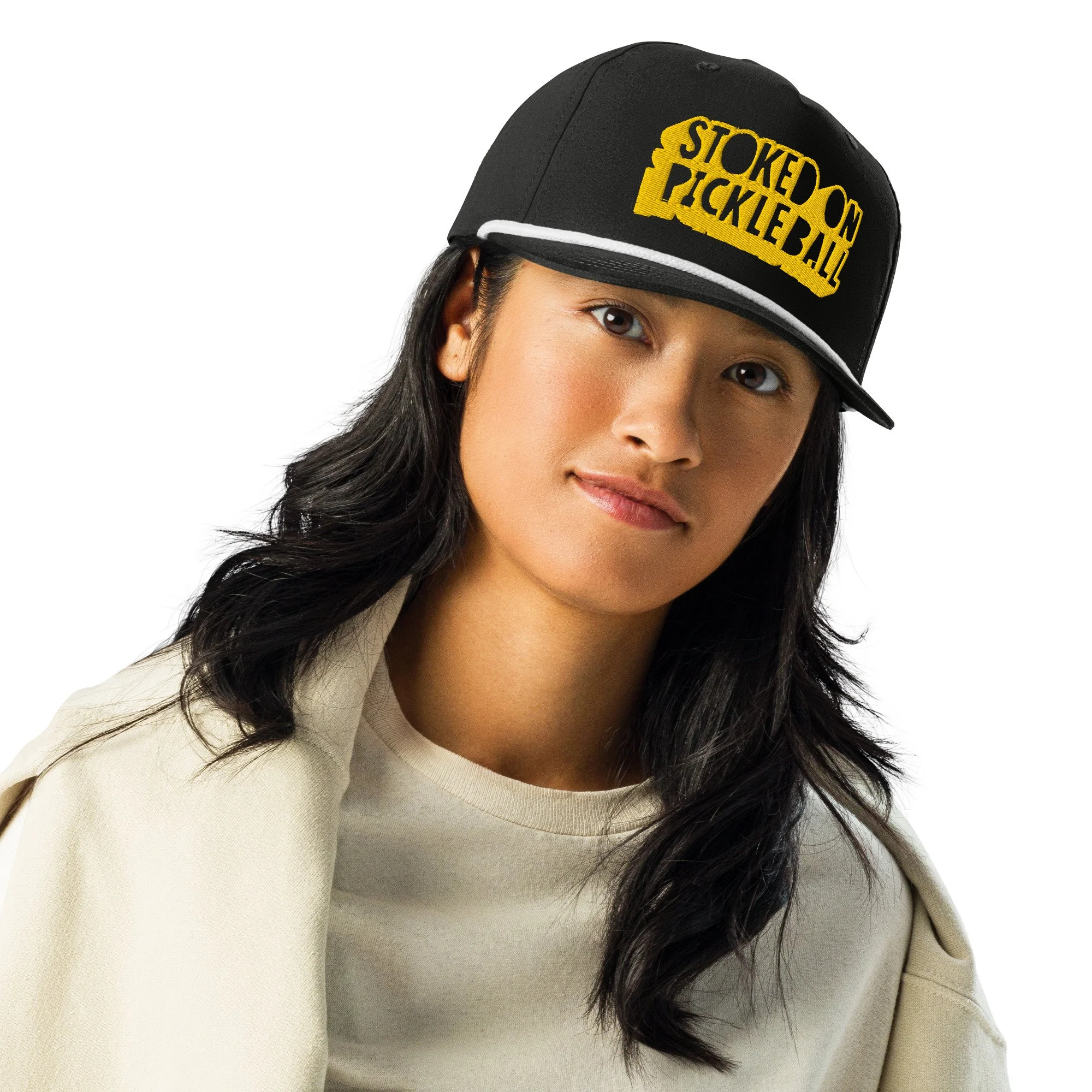 • Semi-curved bill with contrasting rope